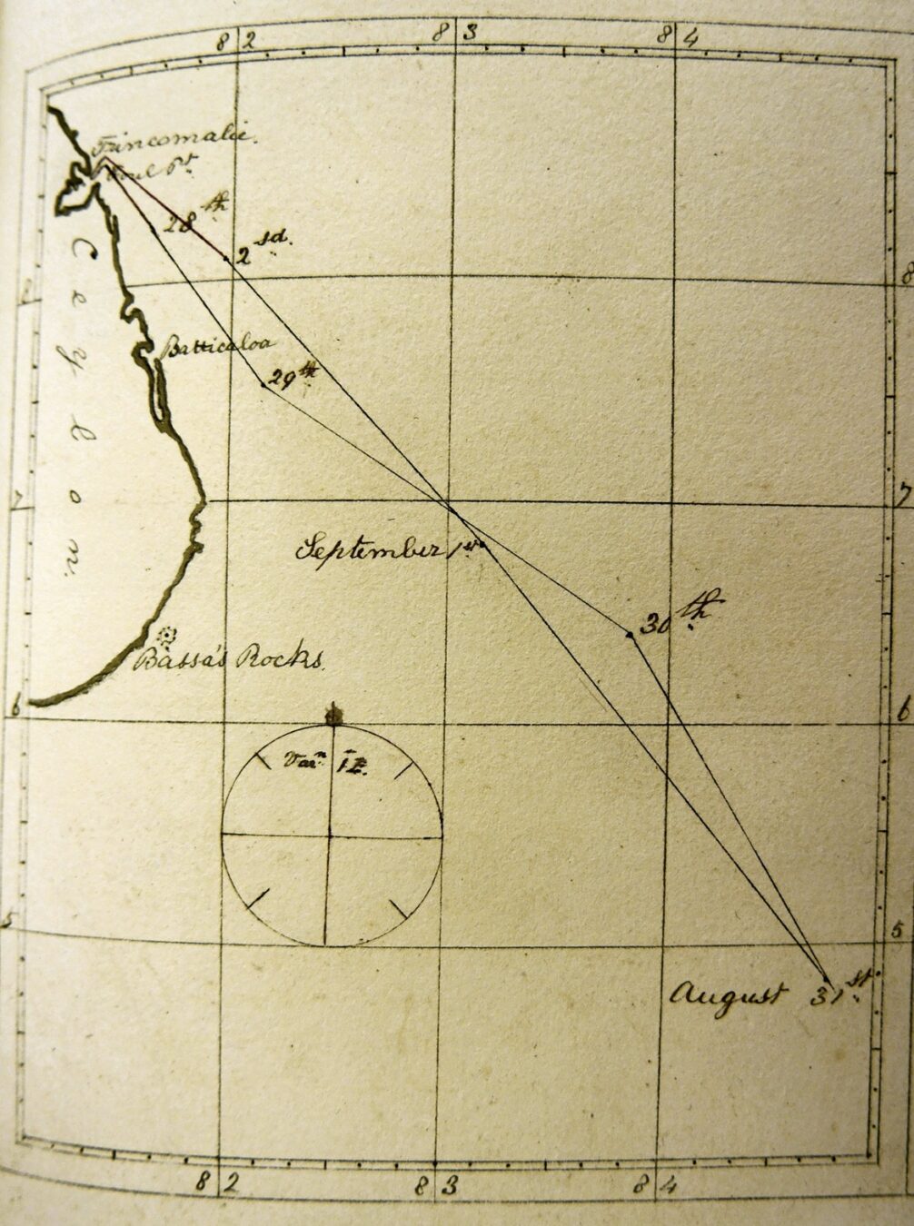 Latitude. 7.12 N. longitude 82.19E Equator 85E. S21E 414 miles. Course ENE until 0400 then SSE ½ S. Wind SSW force 1 increasing through the day to 5.
