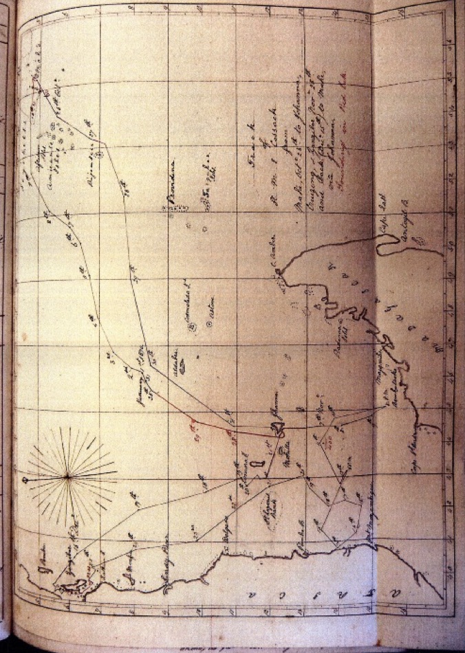 0350 stopped and sounded in 35 fathoms ( white sand) . Proceeded. Observed the Isle of Silhouette E by ½ S. (Seychelles) Made all plain sail on the Fore.