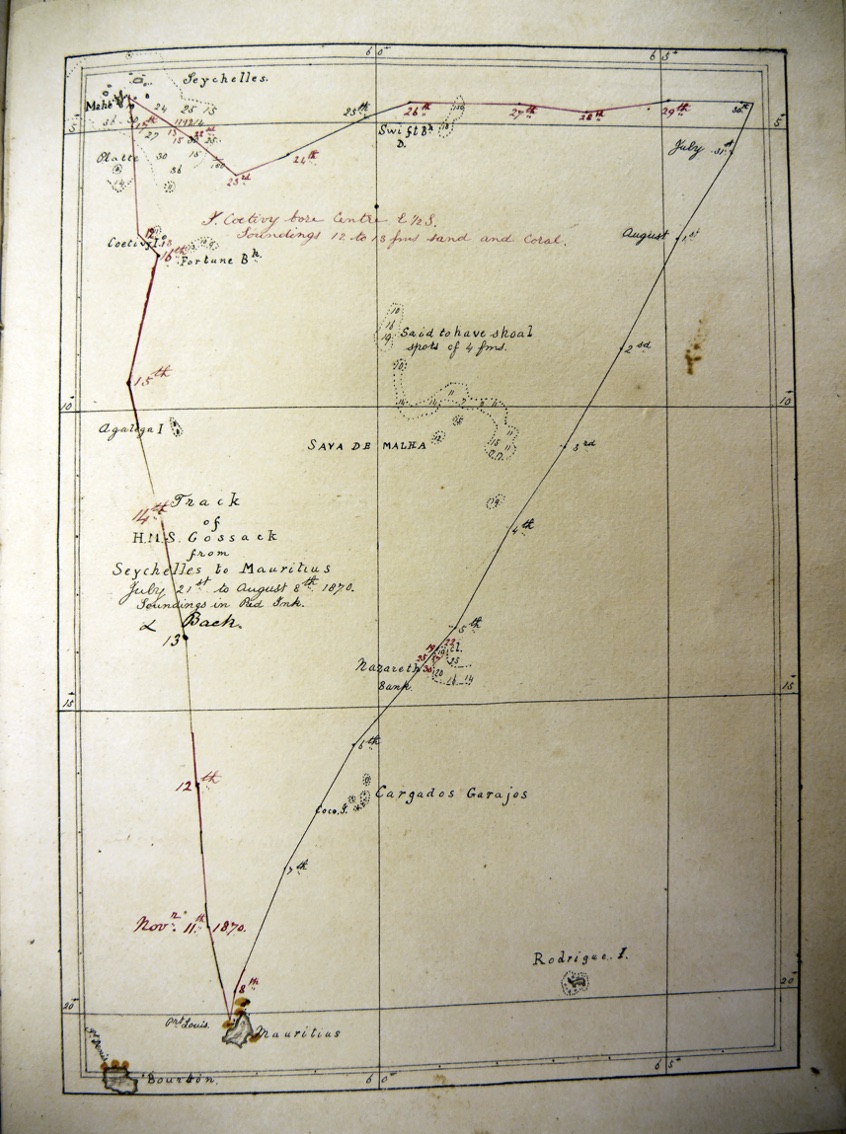 Latitude 7.1S. Longitude 65.13E. course south westerly. Wind SE to SSE force 4.