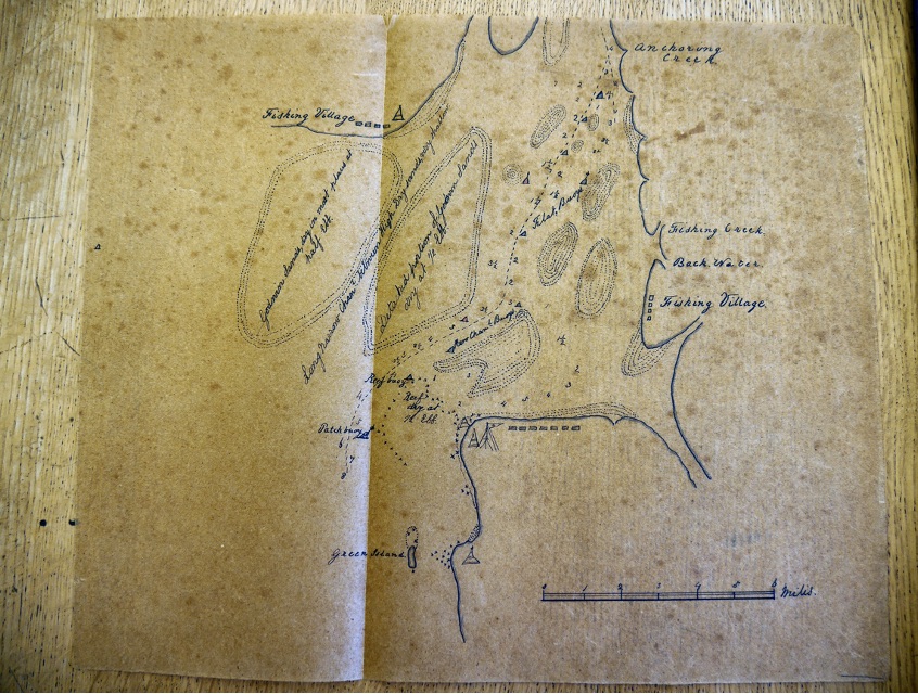 1945. Came to in 5 fathoms with sandy bottom and veered to 2 shackles. Anchored off Diamond Isle. Anchor bearings Pagoda Point NW by W. Diamond Island SSW ½ W.