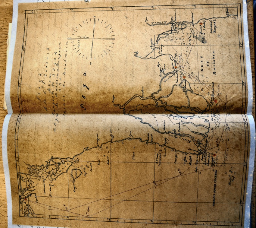 0820 Came to with broken bottom in 4 ¾ fathoms and veered to two shackles. Moored off town of Akyat. River Aracan.