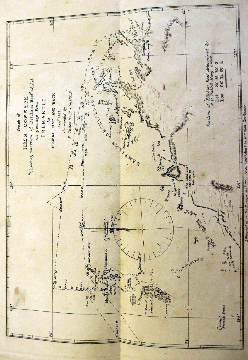 Latitude 25.19S. Longitude 98.10E. Course S46W. Wind SSE force 4 increasing to 5 and 6. Under sail. Barometer 30.12 inches.