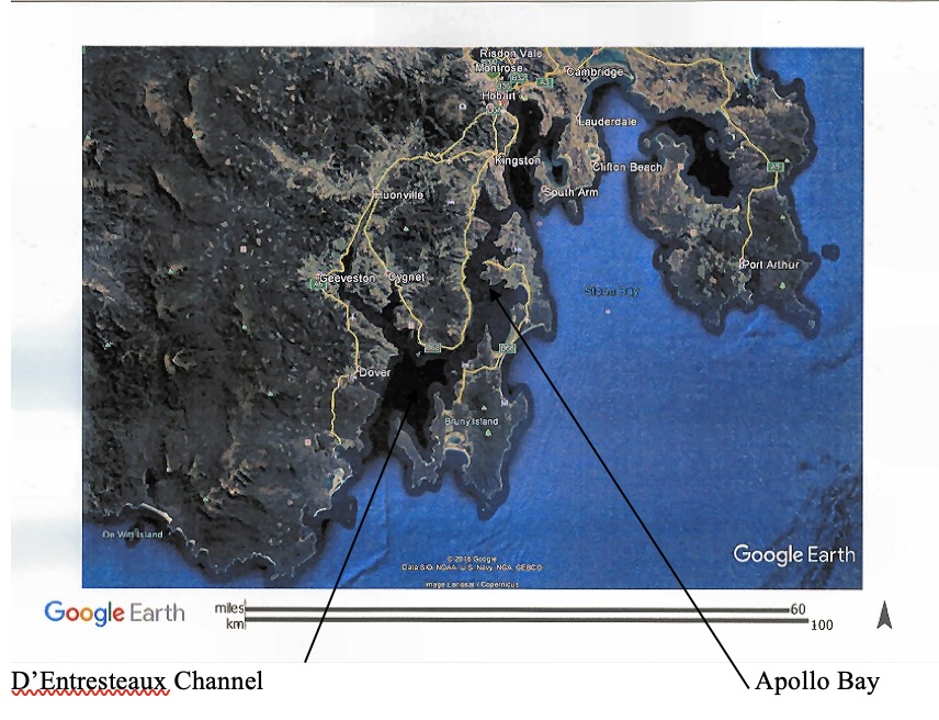 1030. Left Hobart under steam and proceed out via Storm Bay. Wind calm northerly light airs becoming south easterly force 1 to 2 and later southerly force 2. Under sail.