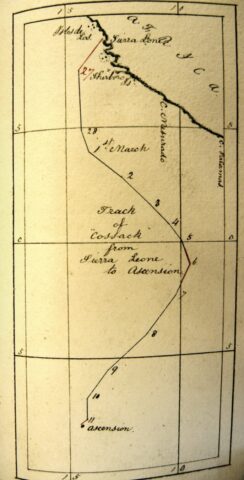 Latitude 7.40S Longitude. 14.08W.Course SWS. Wind SSE. Force ¾. Ascension S47W 23 miles.