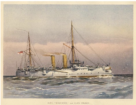 At number 11 buoy at Bombay. Wind calm with broken cloud. Barometer 30.08 inches rising to 30.16 at 0800 before falling to 30.10 at 1600 and finishing at midnight at 30.12inches. Temperature at noon. 79F. 0400. Steam up in cutter. Received 116 lbs of fresh beef and 56 lbs of vegetables plus 235 lbs of bread. 0730. HMS Brisk relieved the Guard. 0900. Employed getting in and storing Quick Fire ammunition. Noon. Wind NE force 2. 1300. HMS Marathon arrived. 1400. Employed storing Quick fire magazine. Coal expended 7 cwt. Number on sick list 15.
