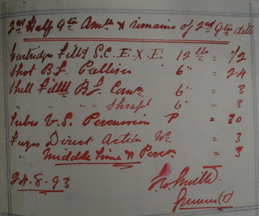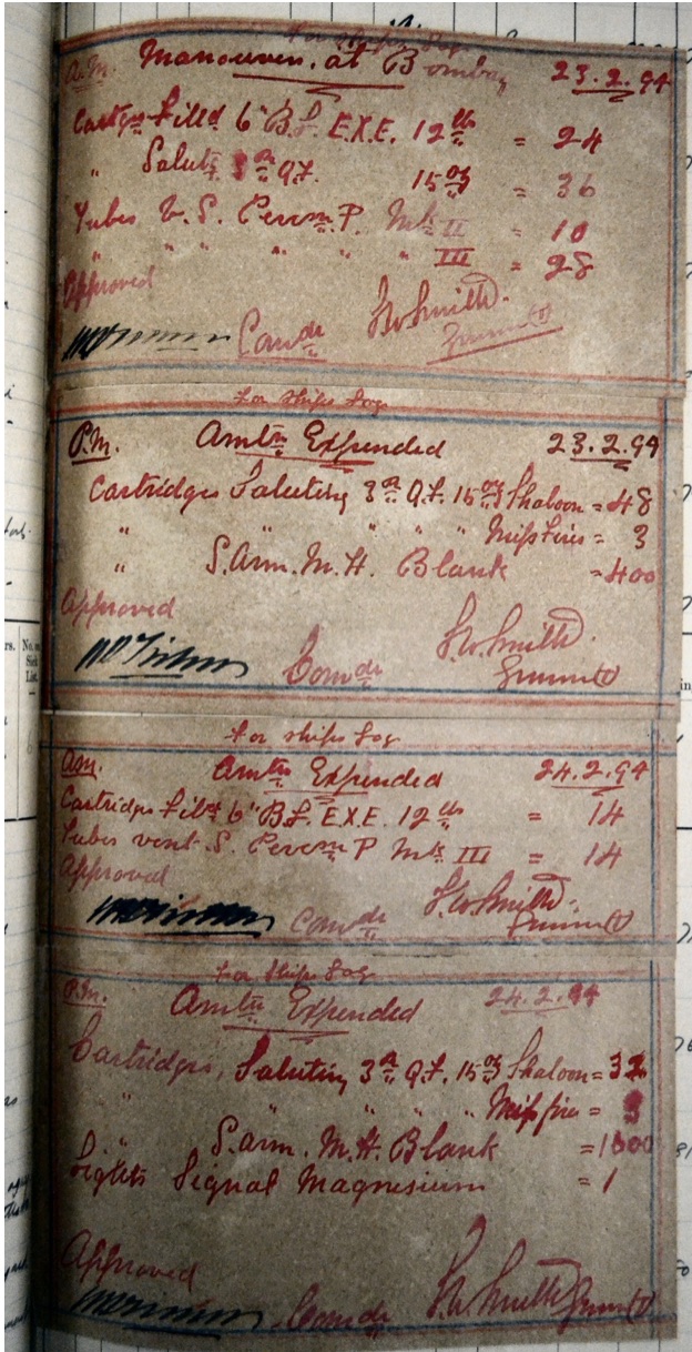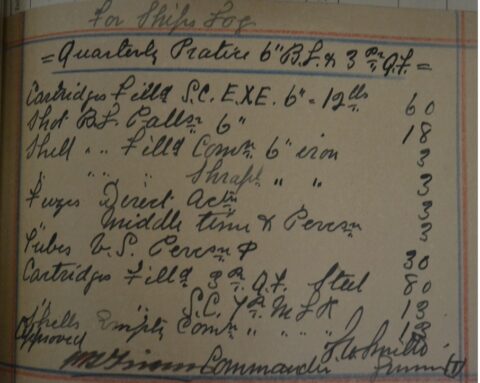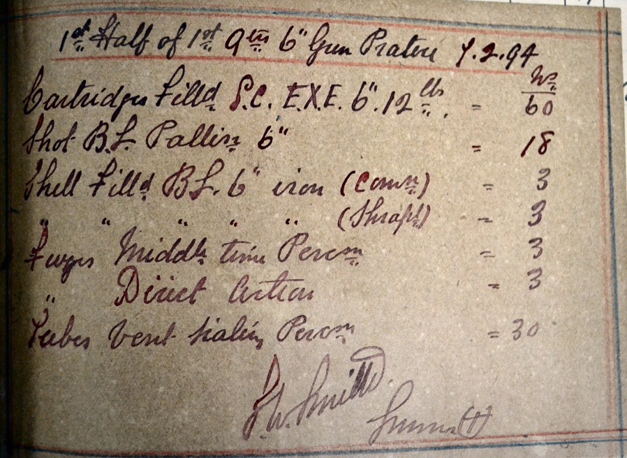 At single anchor at Trincomalee. Wind SW force 3 to 4 with broken cloud. Barometer 29.99 inches falling to 29.91 at 0800 and to 29.9 at noon and to 29.86 at 1600 before finishing at 29.94 at midnight. Temperature at noon 87F. Draught forward. 13 feet Aft 16 feet 8 inches. 0430. Lit fires in two boilers. Received 108 lbs of meat and 54 lbs of vegetables plus 180 lbs of bread. 0800. Wind SW force 4 to 5. 0905. Weighed and proceed as requisite. 0940. Stopped. Dropped target. Proceeded. Exercised General Quarters firing Morris tube and percussion tube at target. 1135. Stopped. (Trincomalee) Came to with port bower in 8 ½ fathoms and veered to 2 ½ shackles. Noon. Wind SW force 4 to 5 with broken cloud. 1300. Employed as requisite. 1600. Wind SW force 3 to 4. 2015. Weighed and proceeded. 2200. Exercised at General Quarters firing Quick Fire guns at target. 2330. Stopped. Came to port bower in 8 fathoms and veered to 2 ½ shackles. Anchor bearings. ??? (Unable to read handwriting) S45W. Flag staff S65E. Coal expended 4 tons 1 cwt. Number on sick list 25.