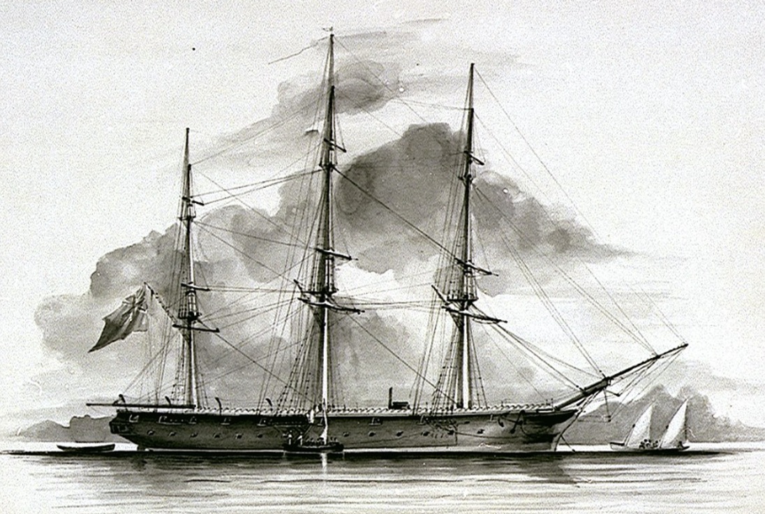 (Sunday) At single anchor at Trincomalee. Wind east force 1 with broken cloud. Barometer 30.10 inches falling to 30.05 at 0800 and rising to 30.06 at noon before falling to 29.97 at 1600 and then rising to 30.13 at 2000 before finishing at 30.01 inches at midnight. Temperature at noon 90F. Received 110 lbs of meat and 55 lbs of vegetables plus 171 lbs of soft bread. 0600. Landed Roman Catholics and Wesleyans for chapel. Noon. Wind E by N force 1. 1600. Wind ENE force 2. Quarters. Coal expended 4 cwt. Number on sick list 13.