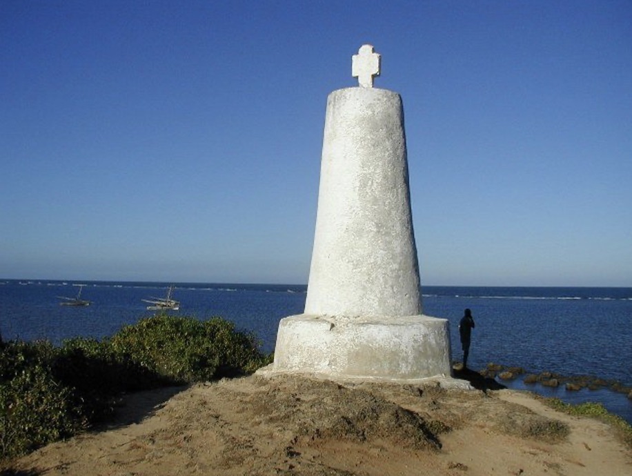 0915 mustered by Divisions and read prayers. 1000. Exercised at General Quarters. 1110. Shaped to SSW. 1300. Altered course to SW by W ¼ W at 6.8 knots. 1415. Exchanged number with HMS Penguin standing to northward. Employed scrubbing canvas and as requisite. 1730 Stopped and came to at Kilifi with sandy bottom I n8 fathoms and veered to 2 shackles’. Banked fires. Steam cutter and gig returned. Bearings at anchorage. Bluff 120 feet S32W Bushy inlet. S83E – magnetic. Vasco de Gamas Pillar N35W 8 miles.