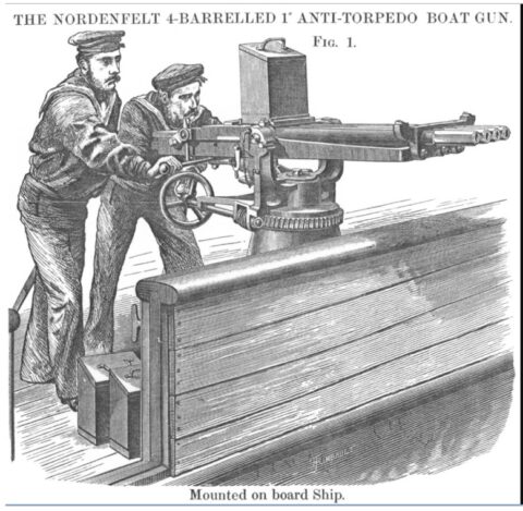 0600. Sent cutter and gig to cruise harbour entrance. 0635 Weighed and proceeded out of harbour. 0730. Shaped course to NE by E ½ E at 40 revolutions – 3 knots. 0800 wind NE force 1. 0900. Increased to 50 revolutions – 4.5 knots. 1000. T boat to board two dhows. Working engines as requisite. Mixed transport WOODCOCK passed to starboard. 1125 Proceeded NE by E ½ E at 50 revolutions – 2.5 knots. Employed as requisite. 1330. Altered course to north. 1430. Stopped – out target. Fired Nordinfelt gun from bridge and travelling carriage; and cannon tube from B.L. (Breech Loading) gun.