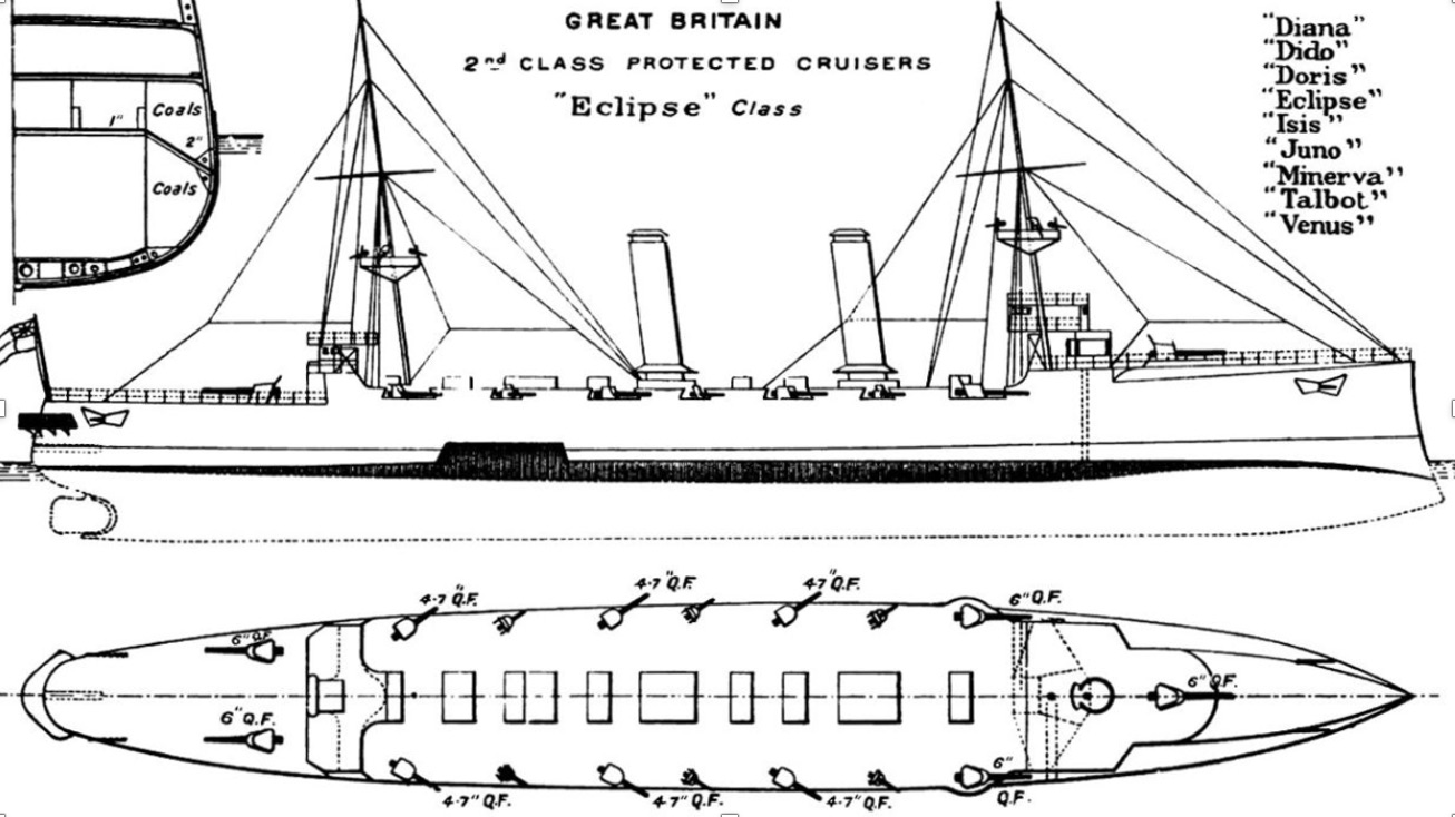 Right elevation, deck plan and hull section as depicted in Brassey’s Naval Annual 1896