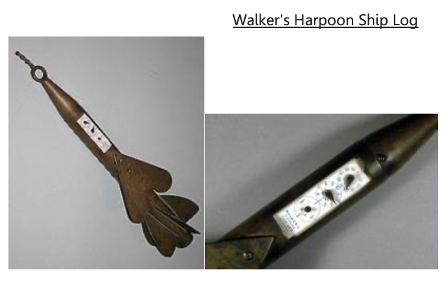 This mechanical log tells the distance the ship sails through the water by recording the number of times the five-finned section of the mechanism turns. The indicator shows nautical miles sailed, in hundreds, tens, and ones. The log was towed astern of the ship and hauled in for readings. Though not perfect, the harpoon log was significantly more accurate than the traditional chip log and sand glass. This instrument was patented September 18, 1866. Thomas Walker & Son was a British firm that patented their first log in 1861. They continued to develop and patent logs into the 1930s.