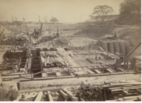 British Library. This photograph, taken in1888 by an unknown photographer, shows work in progress on the 330 ft long Government graving dock, situated on the north-east corner of the half-tidal basin of the Calcutta Docks. A graving dock, otherwise known as a dry dock, is enclosed by gates and pumped dry to allow repairs to be carried out on a ship’s hull.