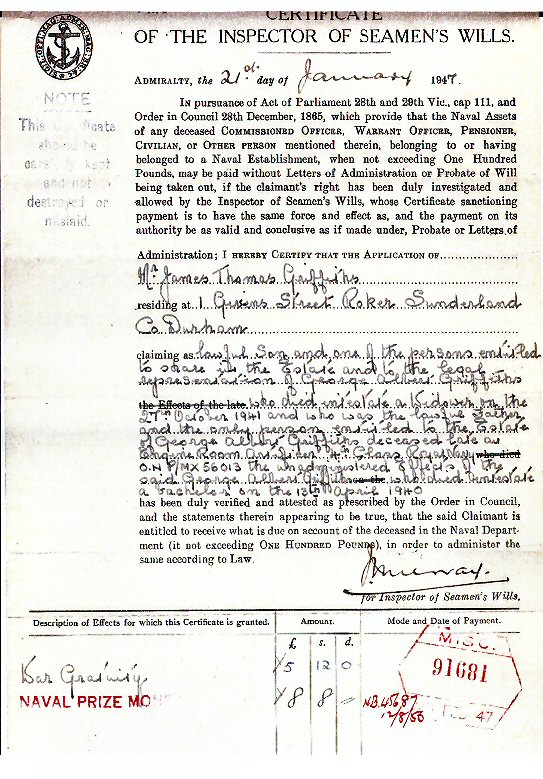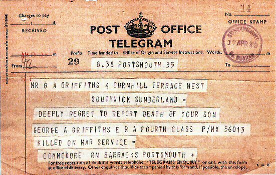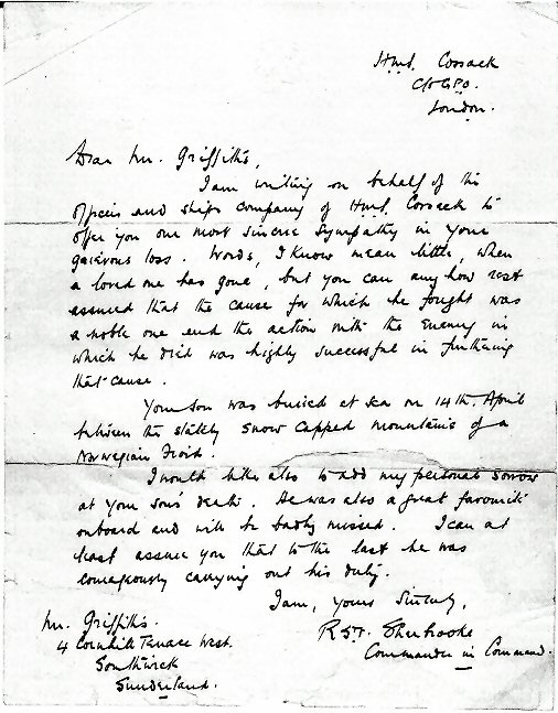 The family home was 4 Corn Hill Terrace West, Southwick, Sunderland. His occupation on joining the Navy was said to be "A Fitter” (Motor Mechanic in a garage)