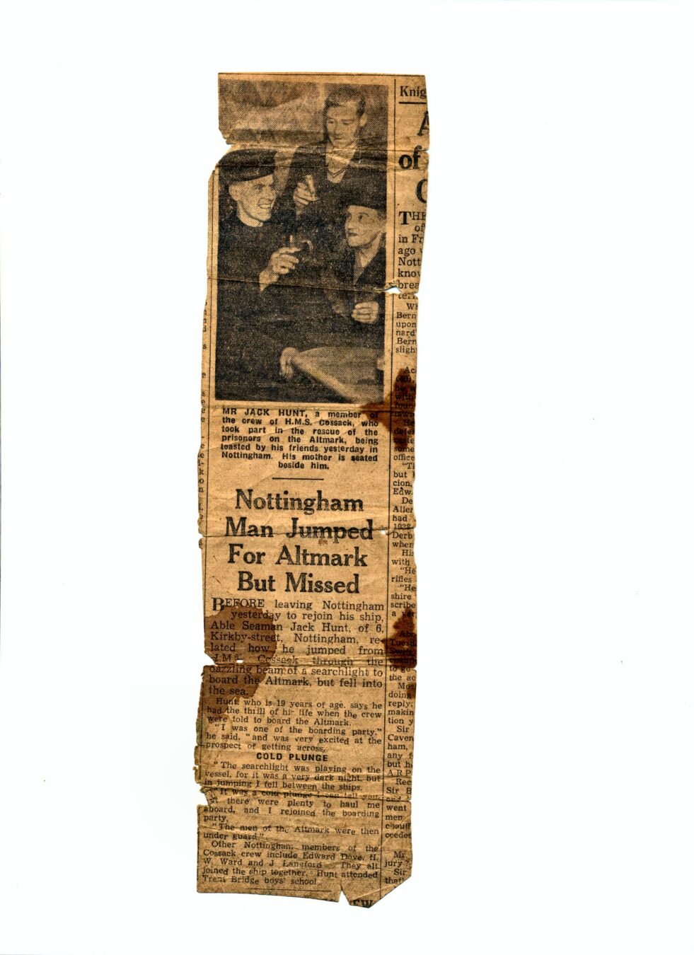 Remarks: Ordinary Seaman/Able Seaman. January 1939 to March 1940? At Altmark incident (aged 19). Press cutting shows he fell in the water but re boarded ALTMARK. Fought with a bare footed German who bumped his head on a lifeboat and passed out. Attended Trent Bridge Boy’s School