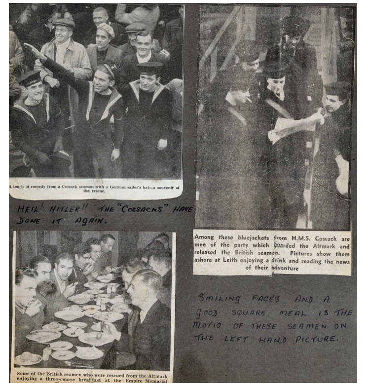 At midnight on 13th February 1940 six of His Majesty’s Ships, the cruiser HMS Arethusa, and the destroyers HMS Cossack, HMS Sikh, HMS Nubian, HMS Ivanhoe, and HMS Intrepid, sailed from Rosyth to search the waters off the Norwegian coast. The Altmark was hugging the Norwegian coast, staying in neutral waters. Despite being “inspected”, but not searched, by Norwegian patrol vessels she continued slowly on her way. Just north of Bergen she was stopped again by the Norwegian destroyer Garm but the Captain of Altmark refused to allow a search and was told to leave the area. The British ships were scattered over a wide area, Captain Vian and HMS Cossack were far to the south investigating the large number of ships in the Leads and among the offshore islands.