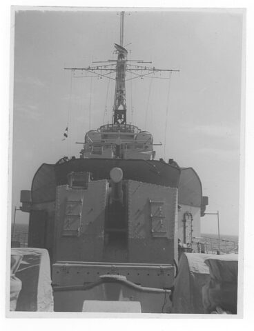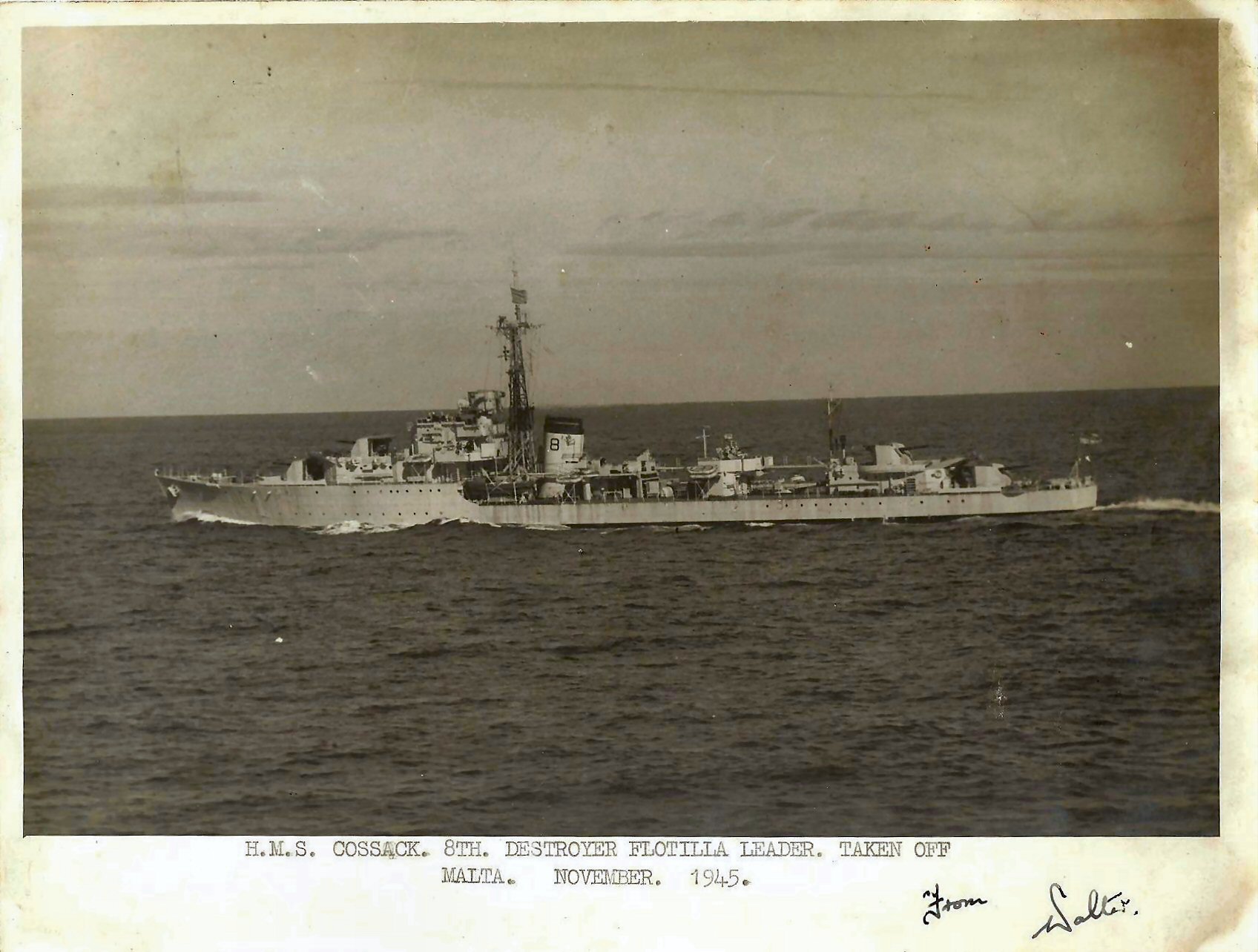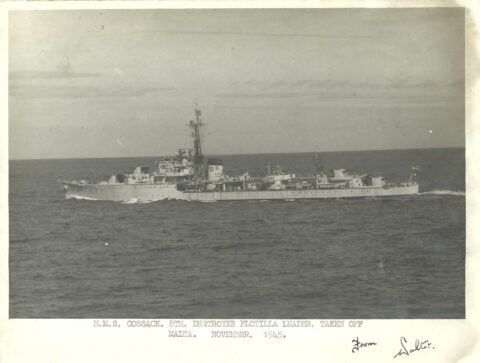 As far as the motto is concerned it is of no great significance. It had no official standing and was probably just a Wardroom jape reflecting the current situation at that time. The change of colour on the ship’s badge would have had to have had some sort of official recognition. The badge in that form appears to have remained in use in COSSACK from 1945 until the ship was finally paid off in 1959.