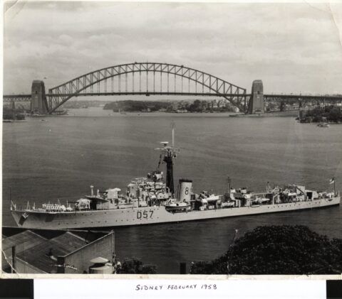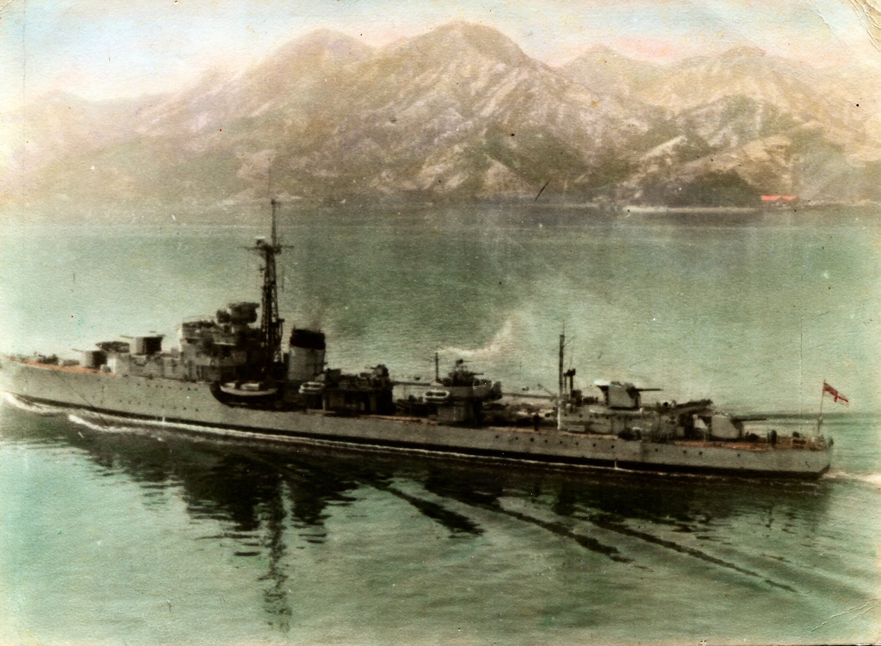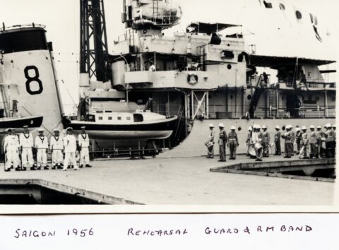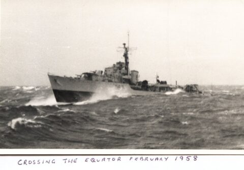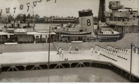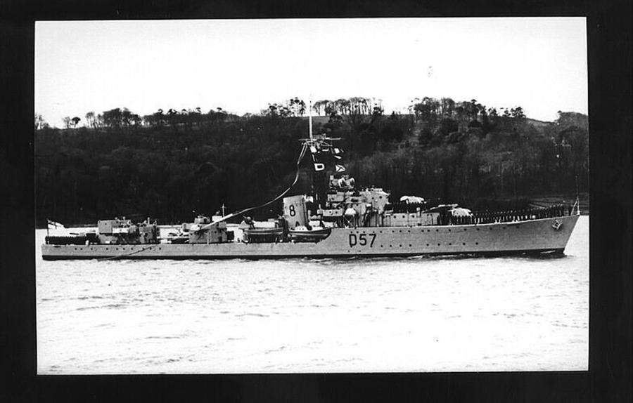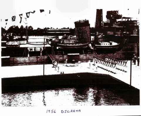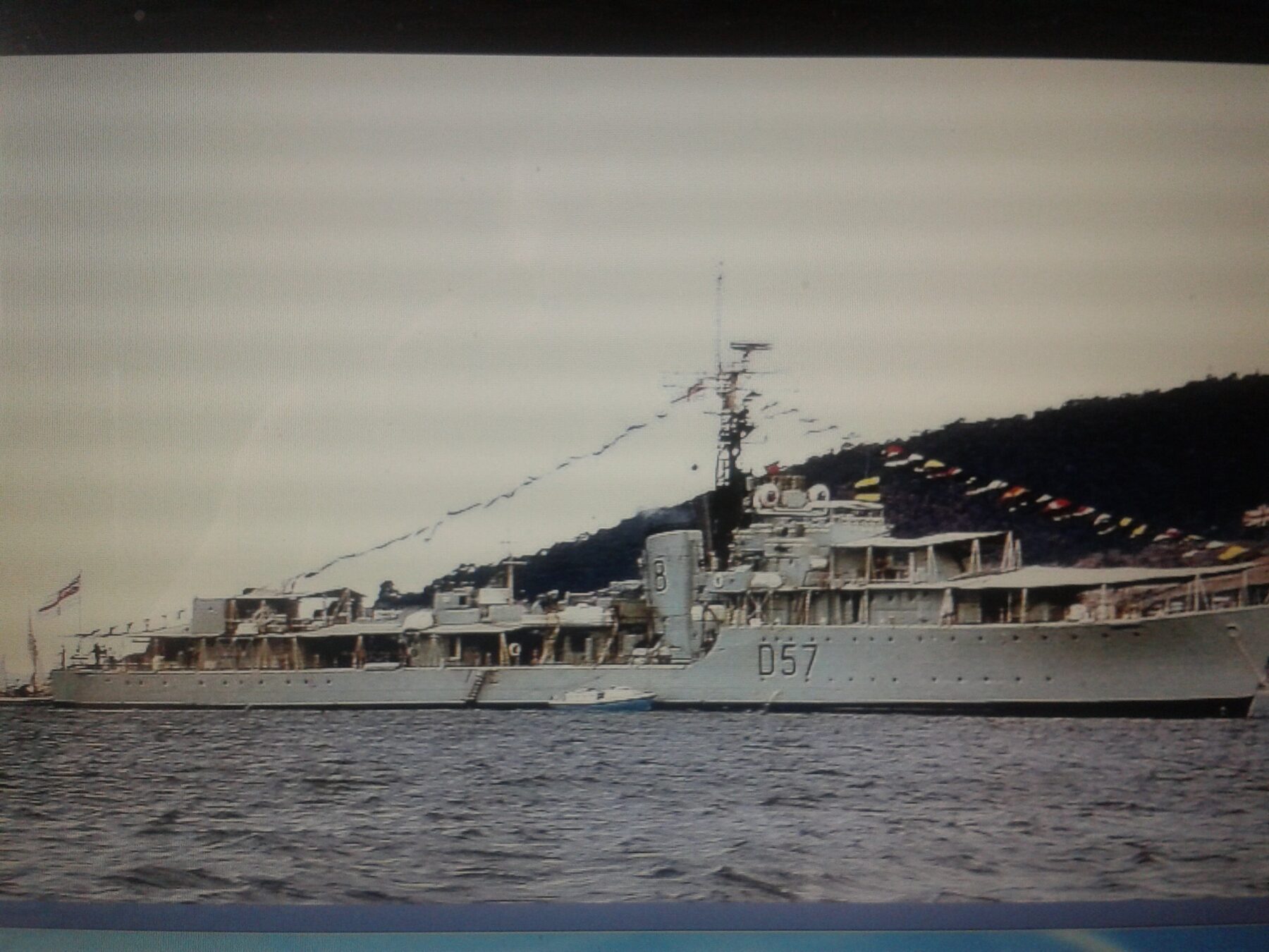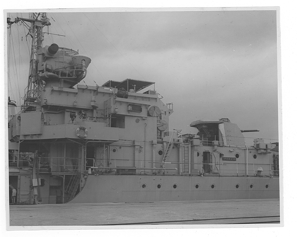 I later asked some of the officers who had been aboard during that first commission about it. The story I got was that when the ship commissioned the smock was white and remained so until just after the war with Japan ended. Demobilisation had started back in UK and with troops returning from Europe. Those in the Far East were told that there would be some delay until reliefs could be organised and sent out. This caused some unrest and a group of junior officers decided to make a protest. During one night alongside the ship’s badge was repainted, red to reflect revolution and the Red Army. The Captain, although he said that they were searching for the culprit, secretly liked the badge in its new colour and no action was taken to revert it to the original colour. As we know, it remained that way until Cossack finally paid off.