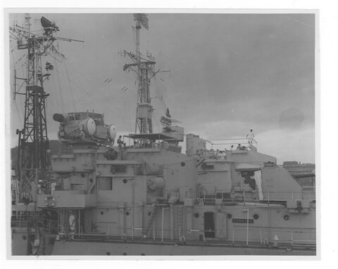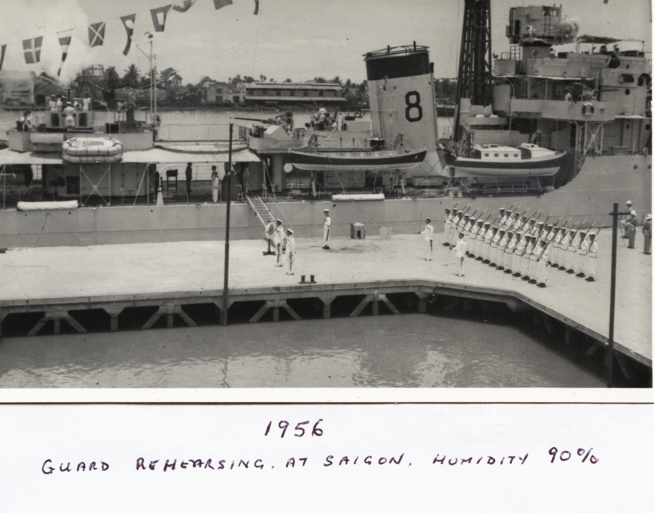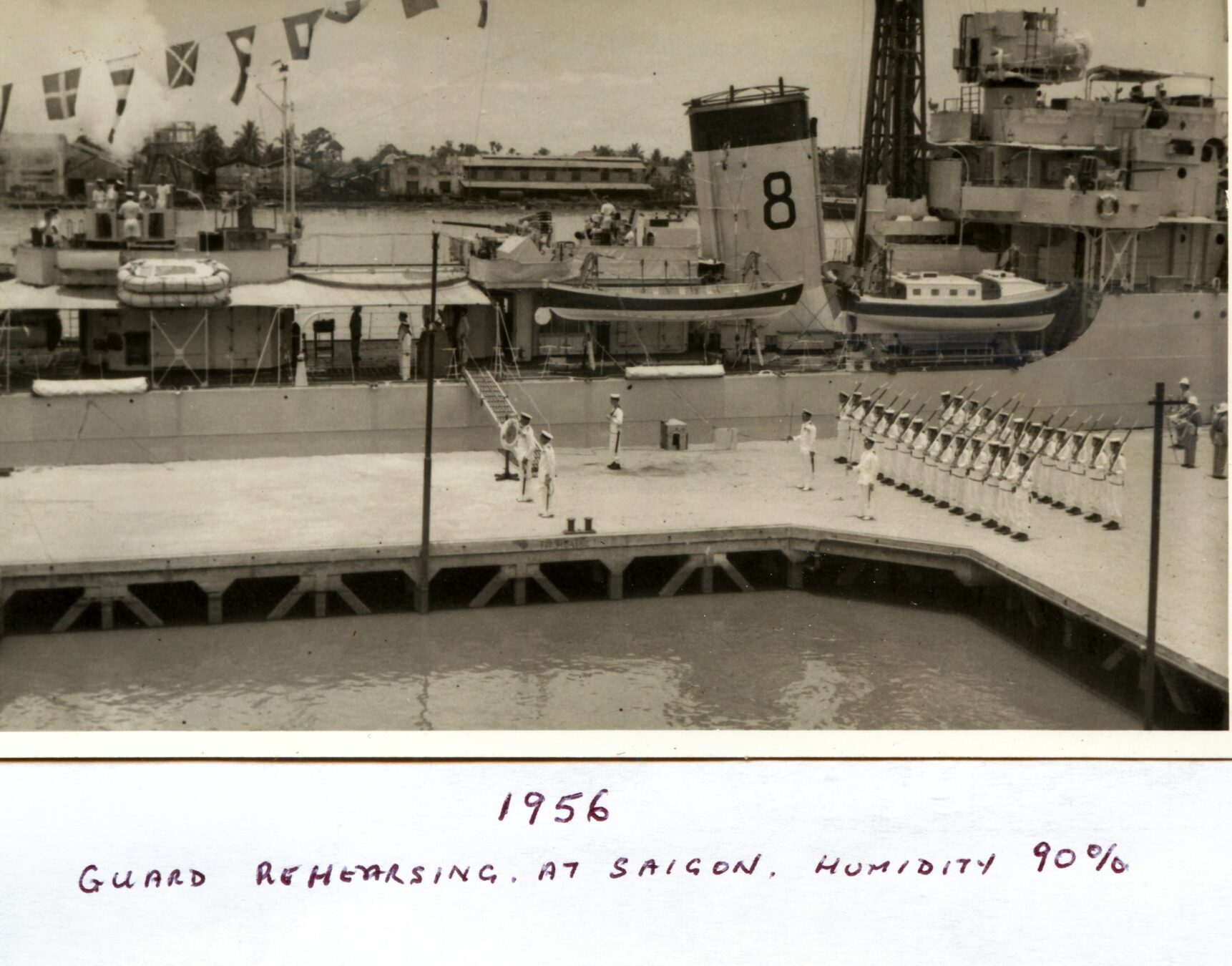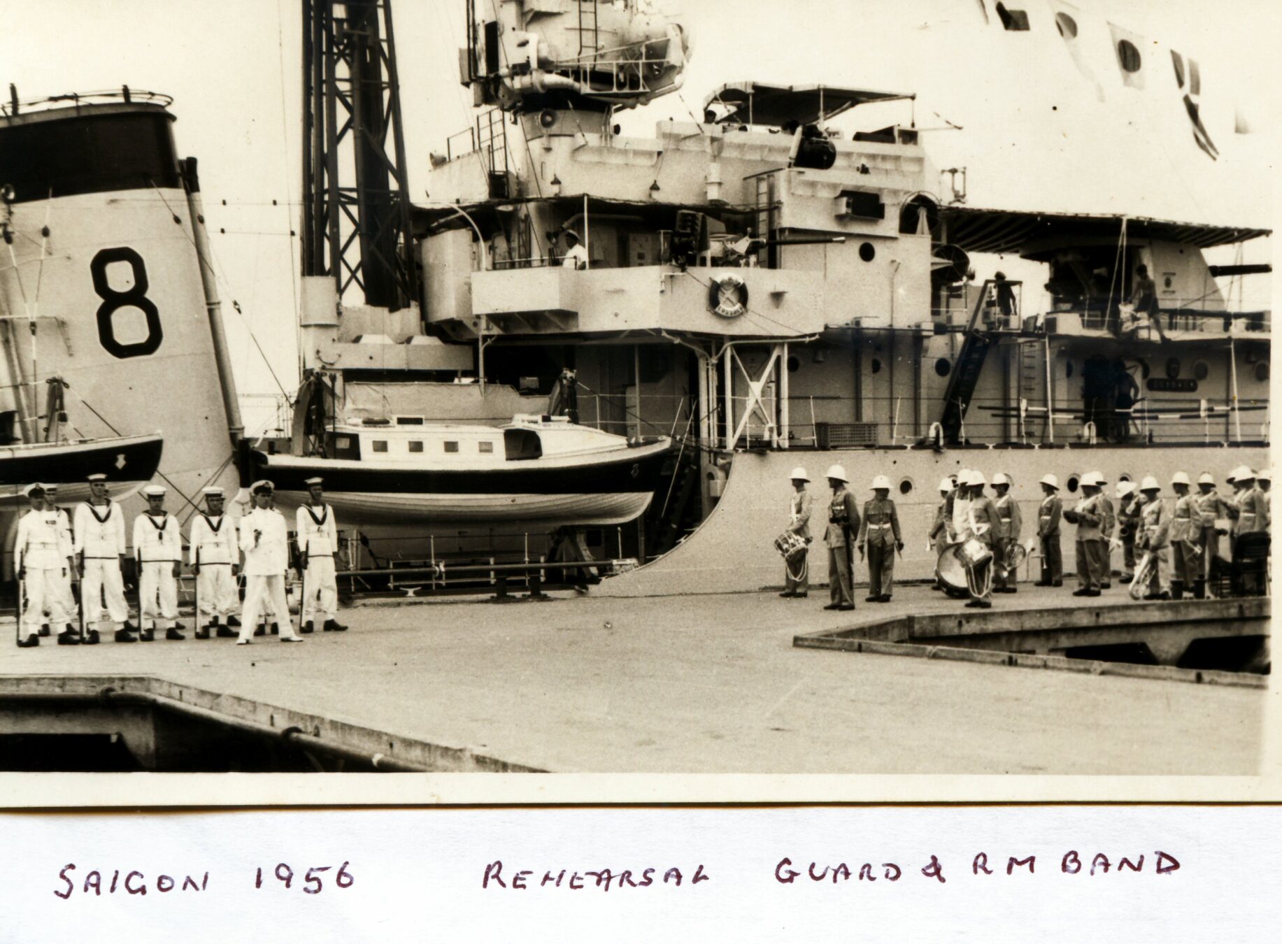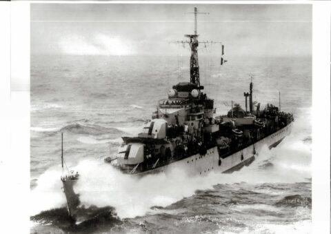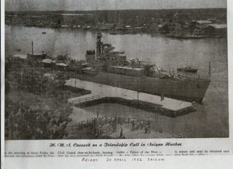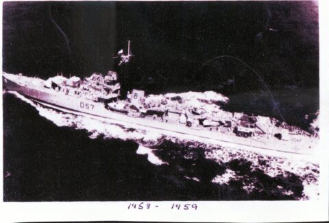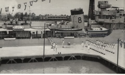I later asked some of the officers who had been aboard during that first commission about it. The story I got was that when the ship commissioned the smock was white and remained so until just after the war with Japan ended. Demobilisation had started back in UK and with troops returning from Europe. Those in the Far East were told that there would be some delay until reliefs could be organised and sent out. This caused some unrest and a group of junior officers decided to make a protest. During one night alongside the ship’s badge was repainted, red to reflect revolution and the Red Army. The Captain, although he said that they were searching for the culprit, secretly liked the badge in its new colour and no action was taken to revert it to the original colour. As we know, it remained that way until Cossack finally paid off.