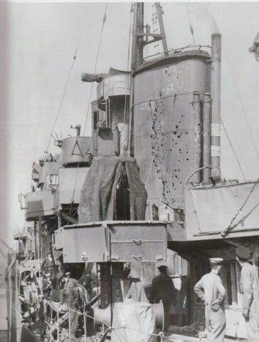 It then became a running battle, carried out at point blank range, with the ships constantly altering courses and speeds in order to confuse the other’s aim. All the guns were firing and considerable damage was done, with the Germans getting the worst of it. The surprise attack so soon after the previous engagement had put them at a severe disadvantage. They also suffered from a shortage of ammunition – the first battle 5 days before having depleted their stocks. Torpedoes were fired by the Germans from fixed torpedo tubes ashore, as the opportunities permitted, but the British ships managed to evade them at this time, although at least a couple ran deep under their hulls. Later the ESKIMO was to lose the whole of her bows to one that did not miss, although she and PUNJABI, seriously damaged earlier on, both made it back to England.